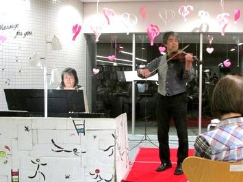 館内にもハートのモチーフを飾ったあたたかい雰囲気の中、三宅孝治さん、佐知子さんがヴァイオリンとピアノでクラシックや童謡など、16曲を生演奏しました。