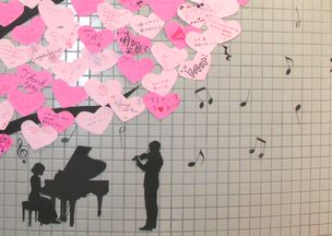 応募していただいたメッセージカードはバイオリン・ピアノ演奏の切り絵とともに会場の壁面を飾りました。