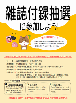 小幡記念図書館では約100種類の雑誌を受入れています。その雑誌についてくる付録を、図書館利用者の皆さまにプレゼントするイベントです。昨年度から、より多くの方にご参加いただけるよう、“抽選申込制”に変更しました。